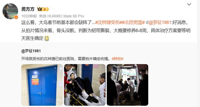 受伤后的第一时间,沈梓捷就被队友抬下了场,马上被队医送往医院拍片检查,好消息是,据沈梓捷的球迷后援会报道,沈梓捷这次没有骨折,是不幸中的万幸;