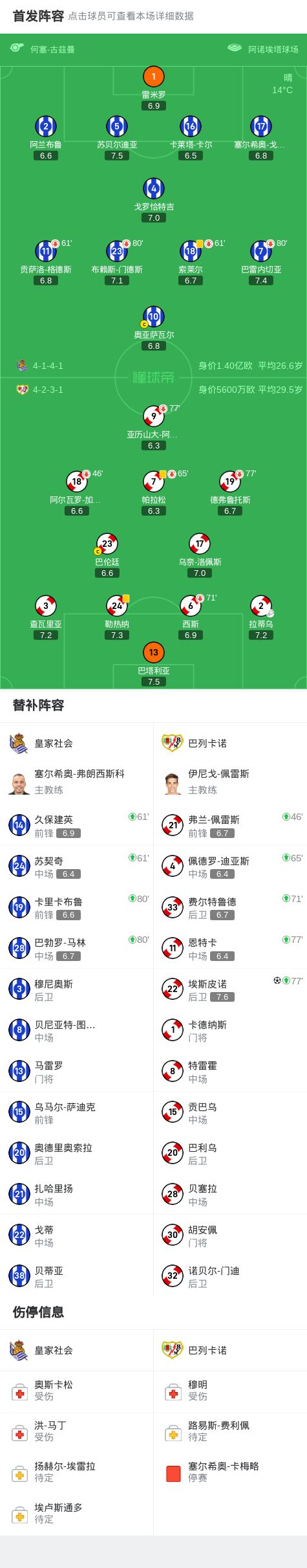 北京时间10月6日西班牙足球甲级联赛 联赛 第8轮,皇家社会主场对阵巴列卡诺。巴列卡诺埃斯皮诺破门。最终比分皇家社会 0-1 巴列卡诺。